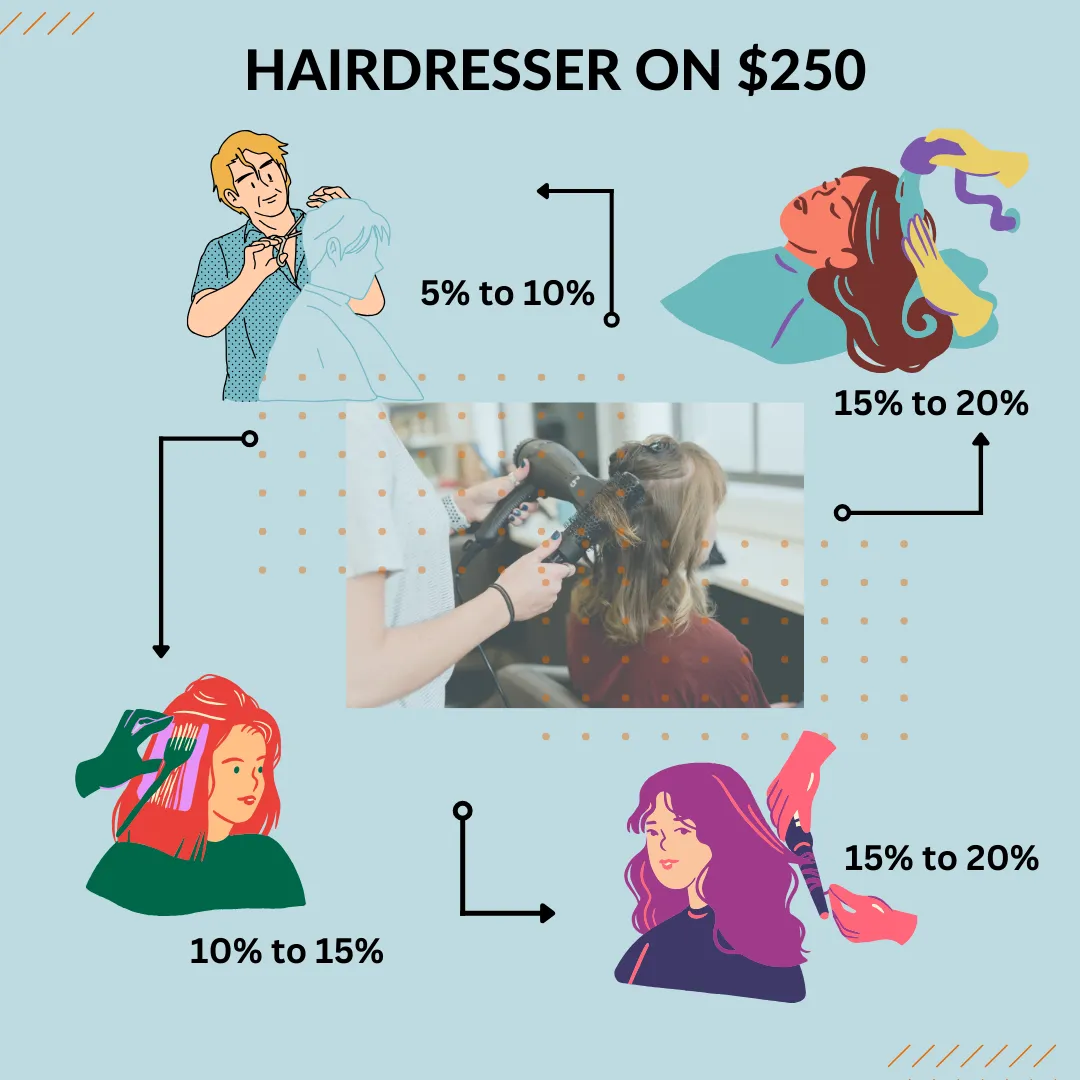 Time and effort are precious. This calculator is designed to find out how much to tip a hairdresser on $250 will relieve you from the burden of calculating the percentage of the tip you wish to offer for the service provided. Usually, an average of 10% to 20% tip is offered. However, based on your experience and satisfaction, you can wish to provide a tip beyond this standard range.