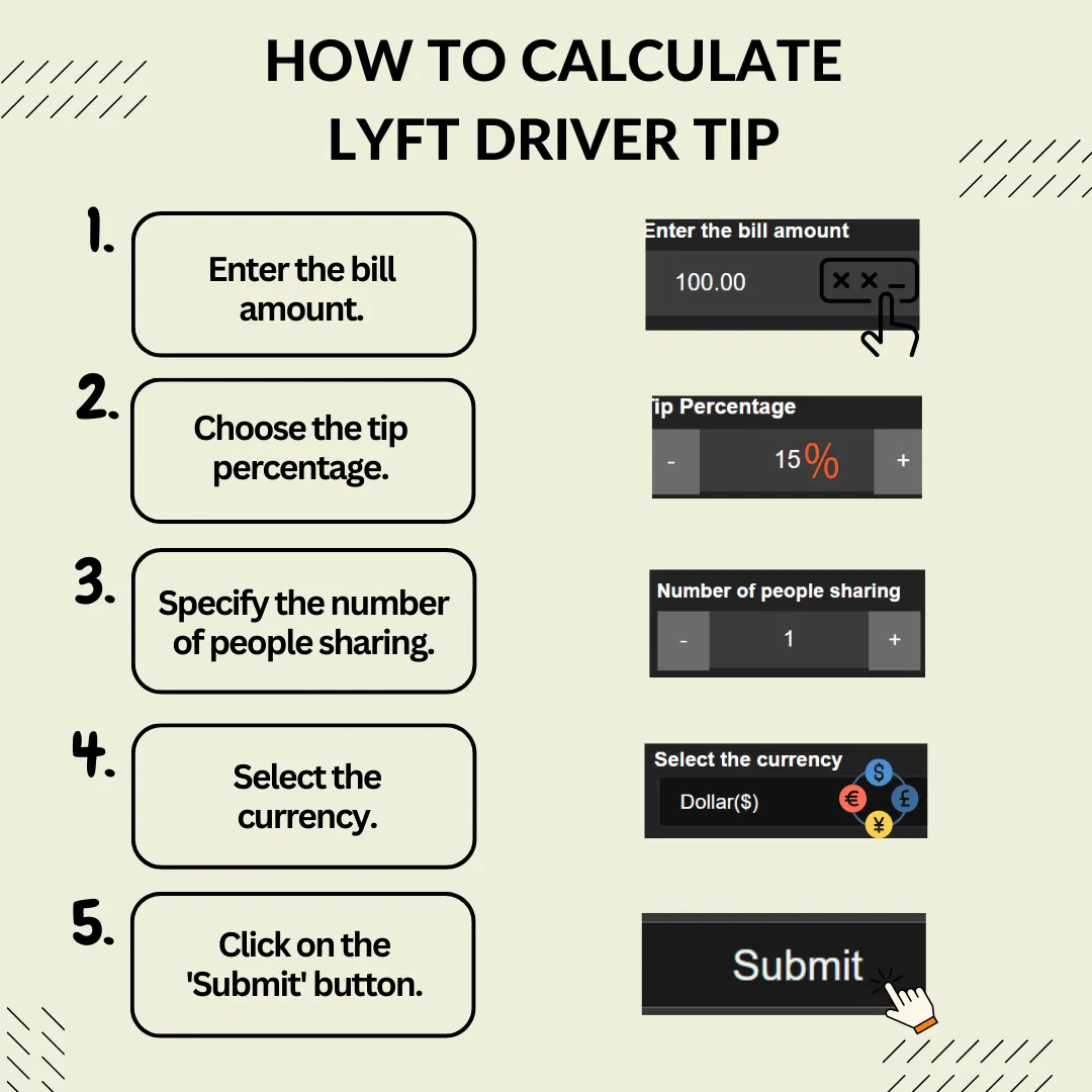 Using the tip calculator for Lyft drivers is very easy. All you need to do is enter the bill amount, select the tip percentage, and click the ‘Submit’ button.
