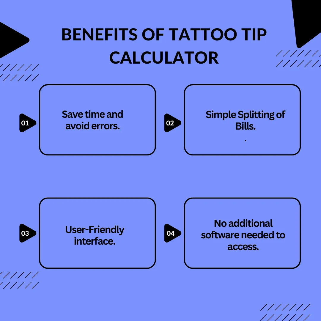 Do not worry about the process of downloading or account registering for the tool to use. This is a safe and secure website that is accessible through your preferred device’s browser. Simply input the bill amount and desired tip percentage, and our tool will instantly calculate the right tip amount for a tattoo artist.