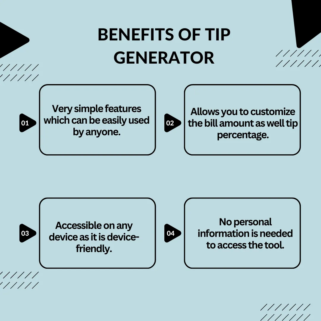 The generator typically calculates any value of tip percentage based on your satisfaction and experience with the service.