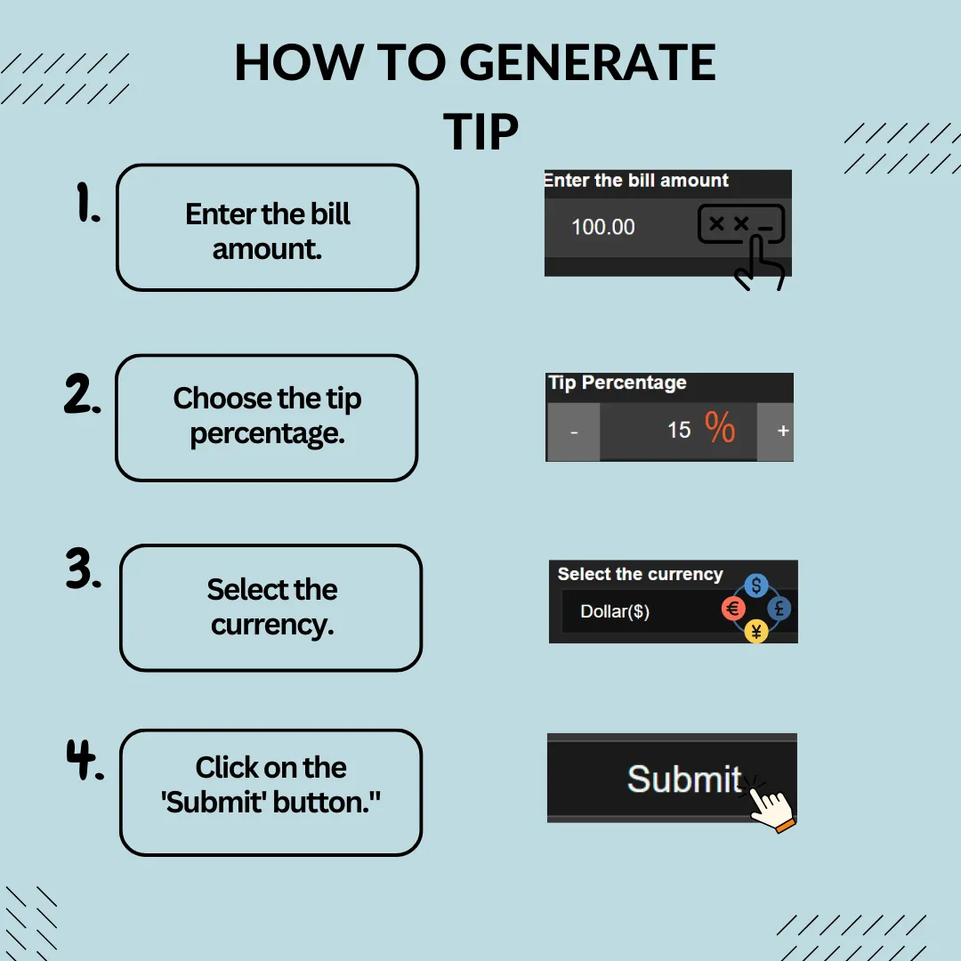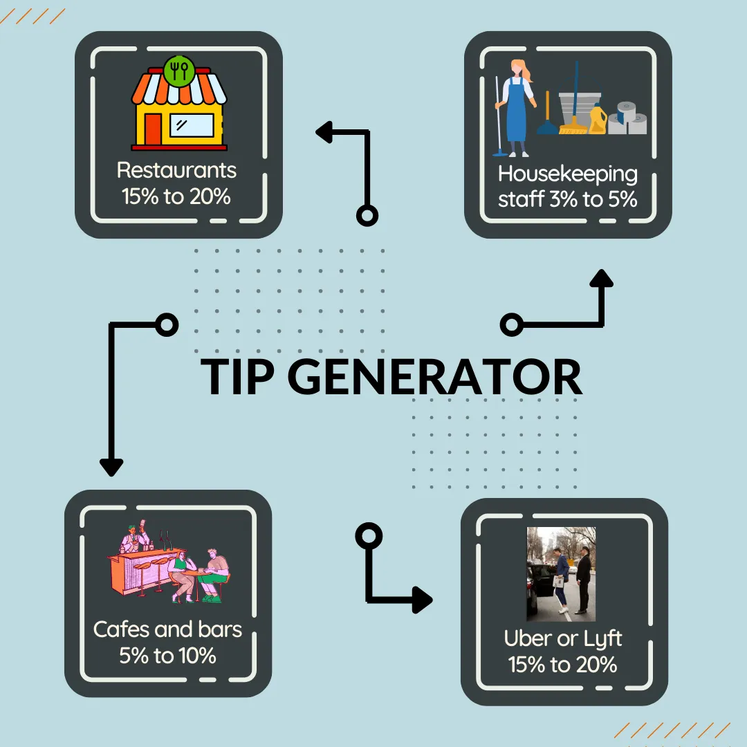 Our tip generator is made to work with any kind of service that includes tip. You can adapt it to various services.