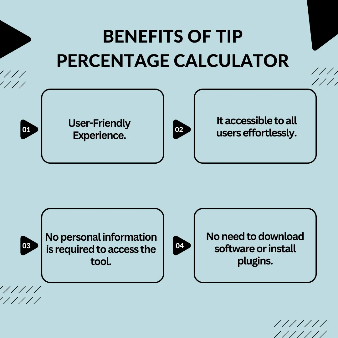 Exploring our tip percentage calculator requires no registration or login details. No personal information is required to access the tool, and there is no need to download software or install plugins. Enjoy the ease of using an unrestrained tool.