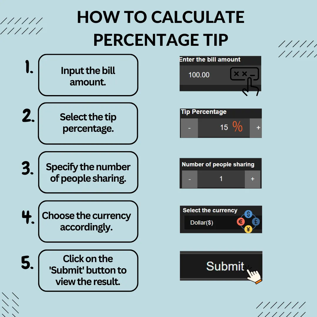 Our tip percentage calculator offers the flexibility to tailor both the bill amount and tip percentage to your preferences. Select any bill amount, whether it includes decimal or non-rounded figures, and specify the desired tip percentage. Additionally, you can indicate the number of persons sharing the bill. The tool also provides support for various currency options, enhancing convenience.