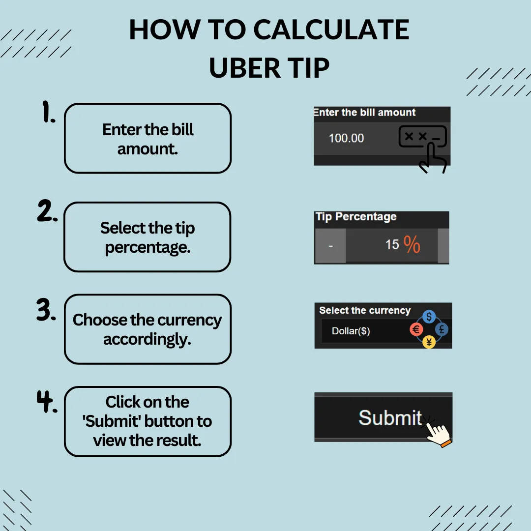 Traveling is a part of life. If we reach our destination with the help of Uber services, then it is worth considering tipping the Uber drivers. Our Uber tip calculator will give you the exact tip amount based on your bill and the percentage you want to choose to pay. Then, click on the submit button to get the right tip amount.